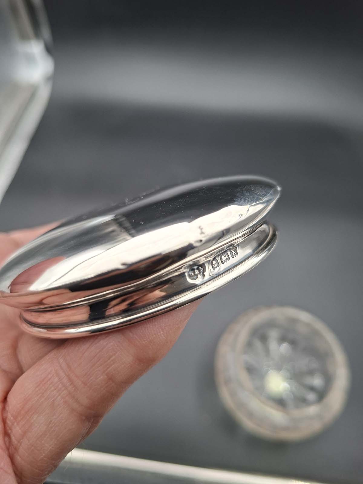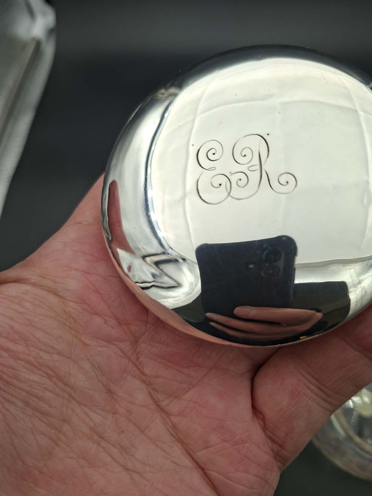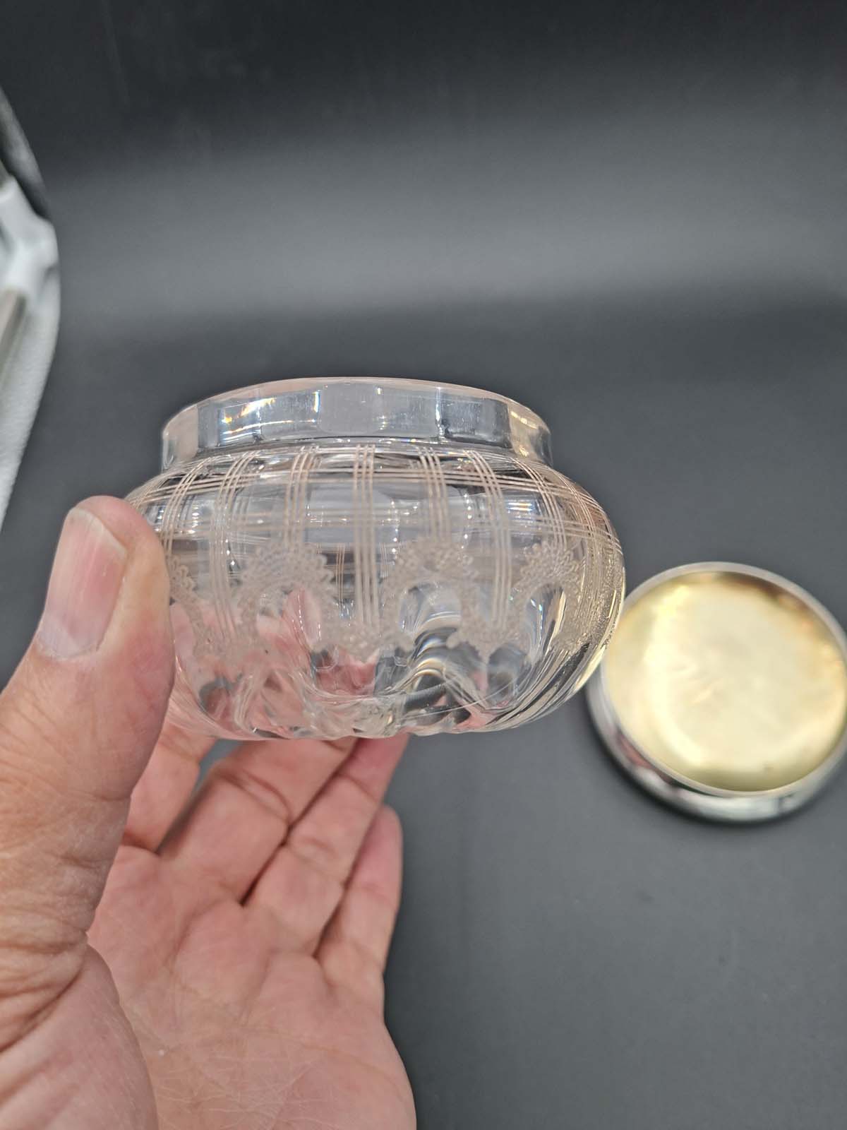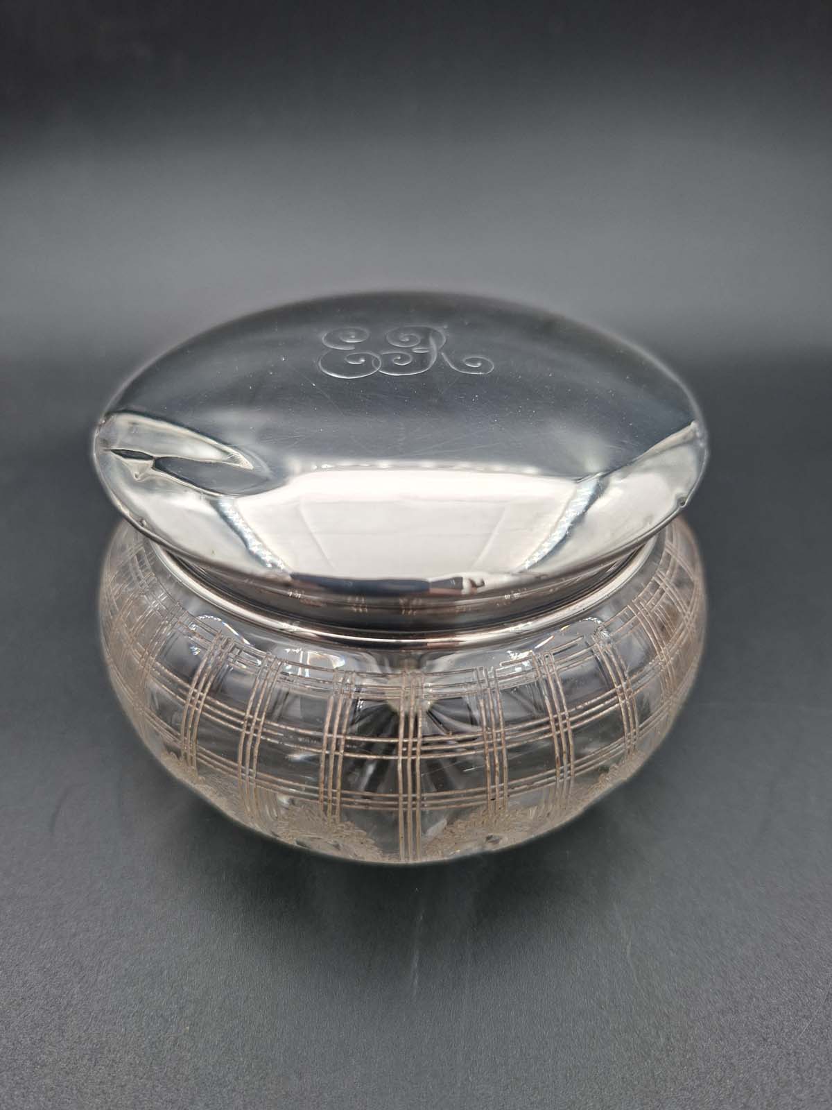 A lovely Vanity jar with monogrammed “ER” sterling Silver Lid on an attractive etched glass jar. Birmingham 1922, Makers marks are unclear. Weight: Lid Only 27.48g