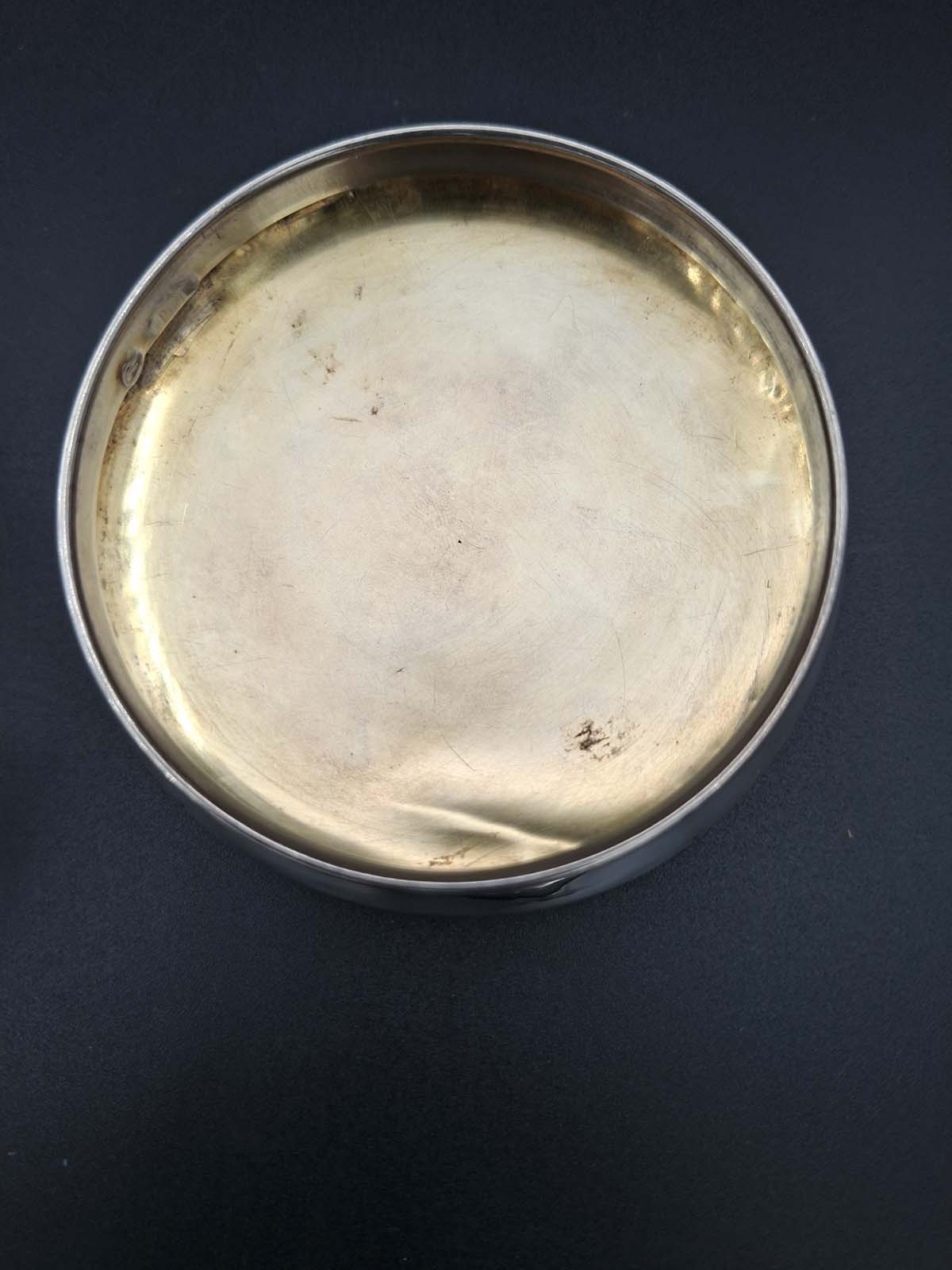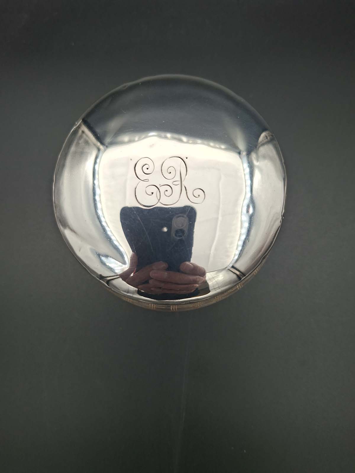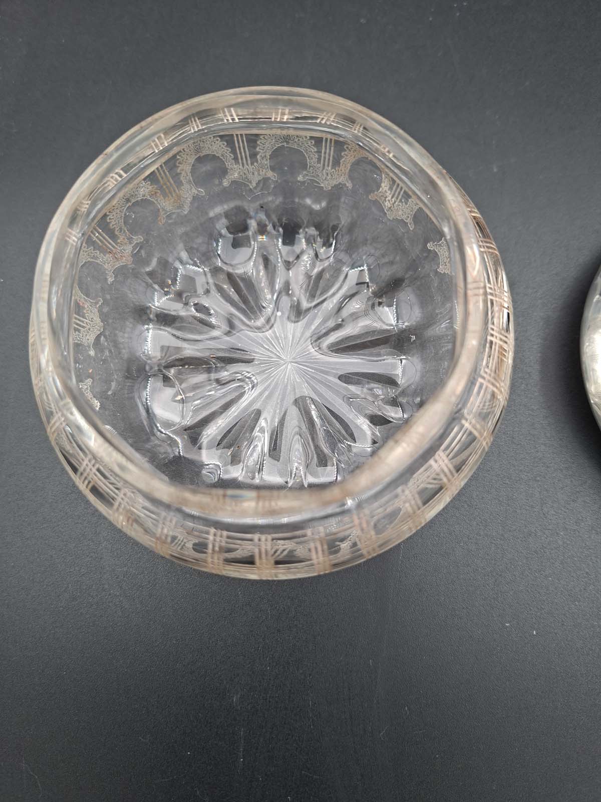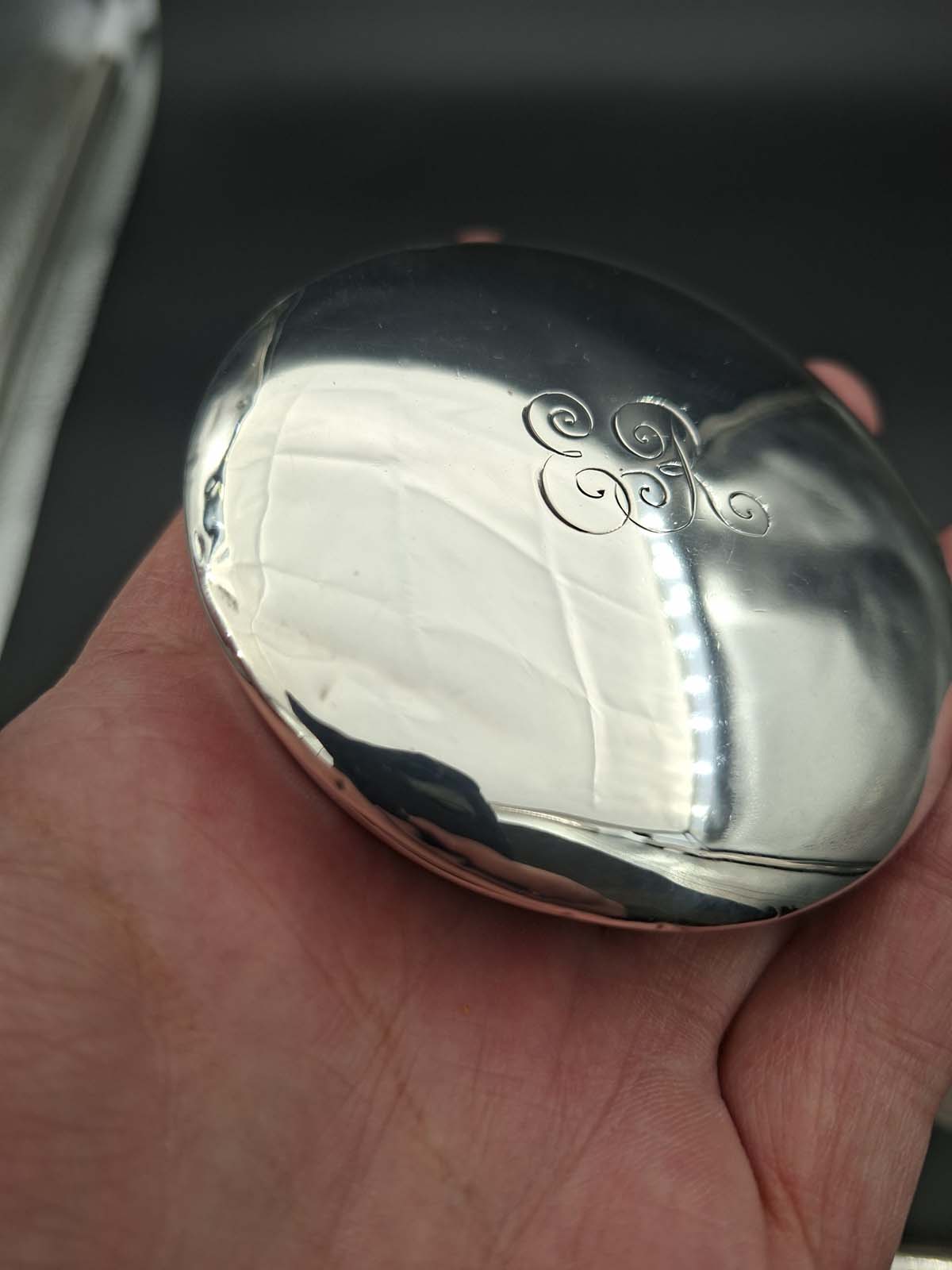 A lovely Vanity jar with monogrammed “ER” sterling Silver Lid on an attractive etched glass jar. Birmingham 1922, Makers marks are unclear. Weight: Lid Only 27.48g
