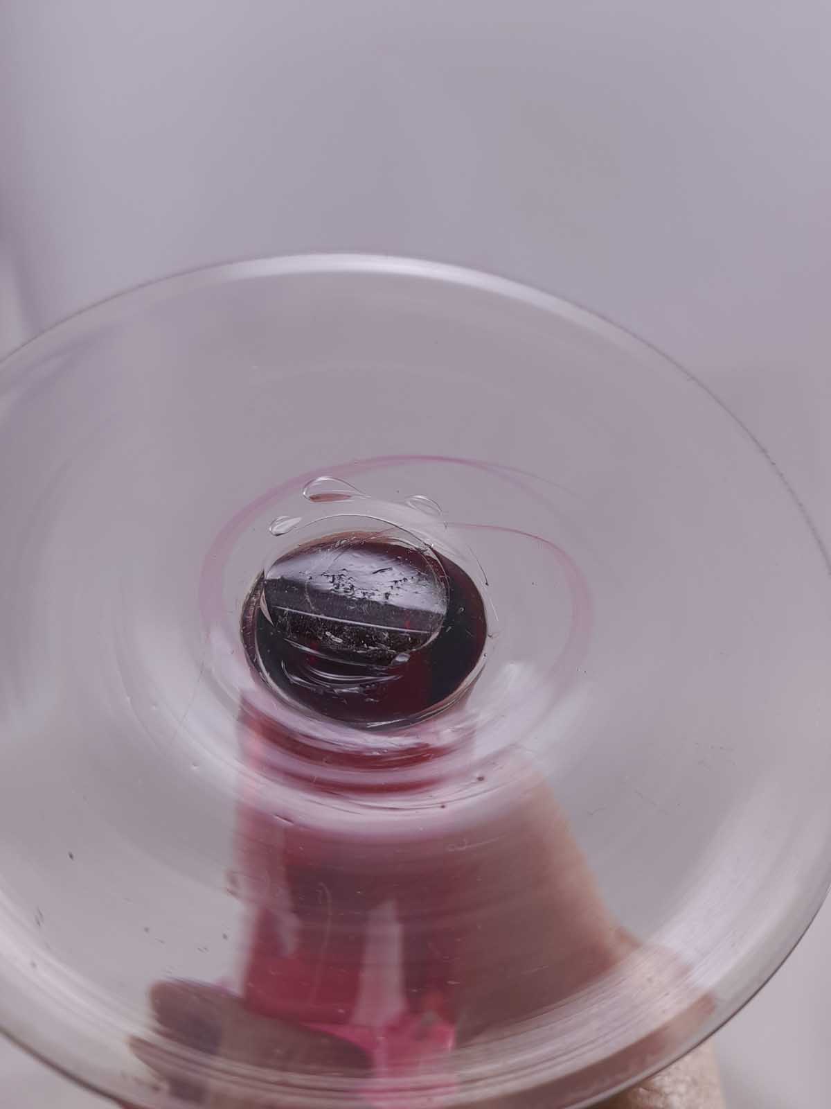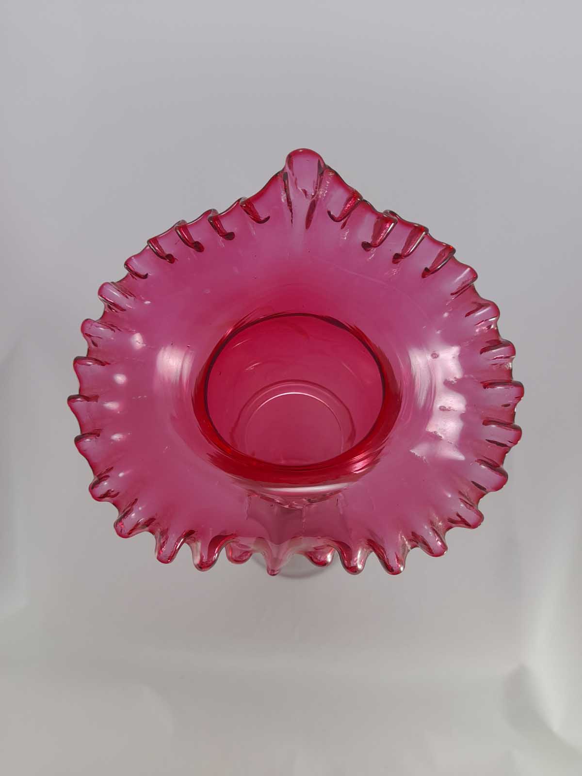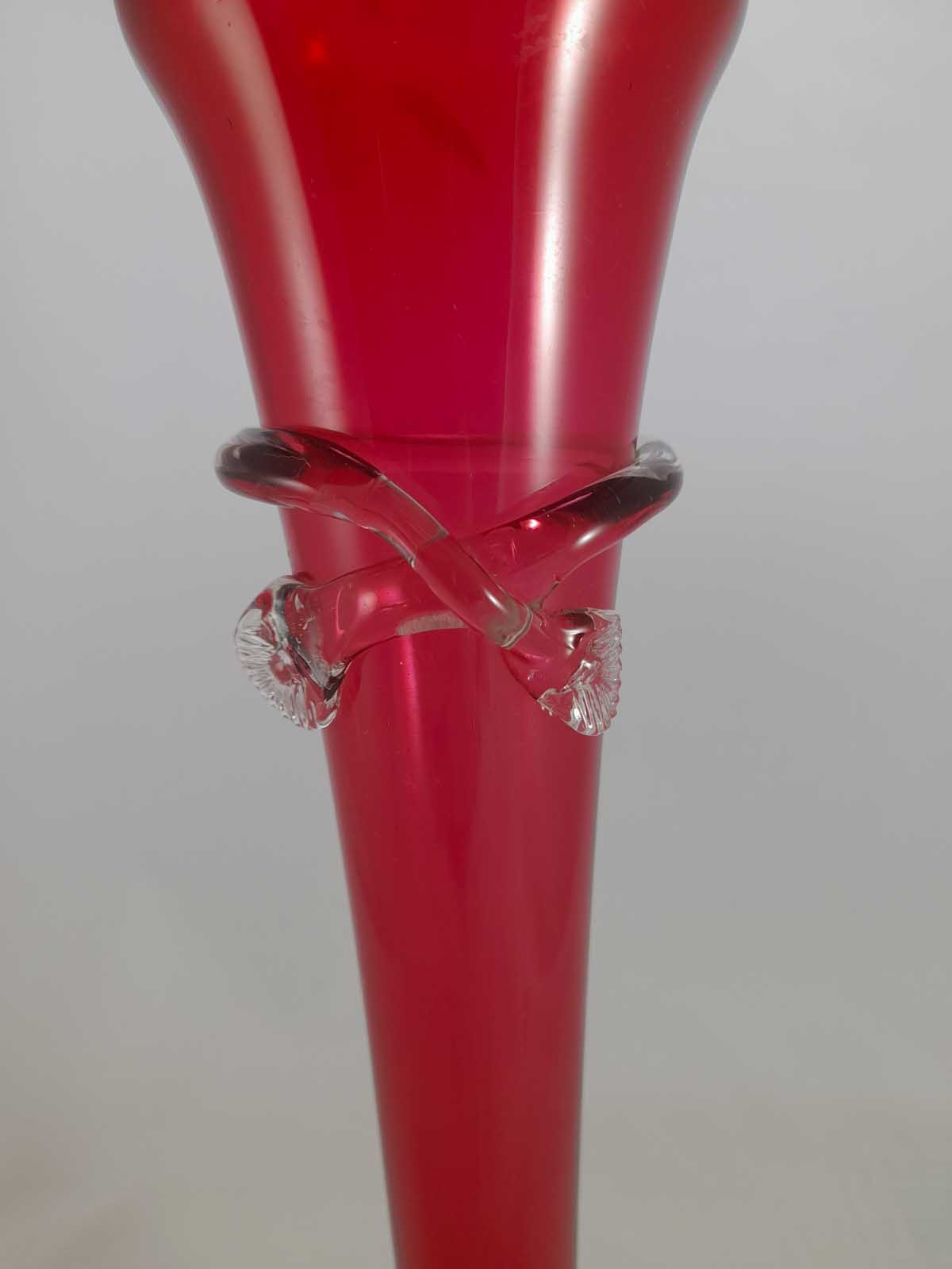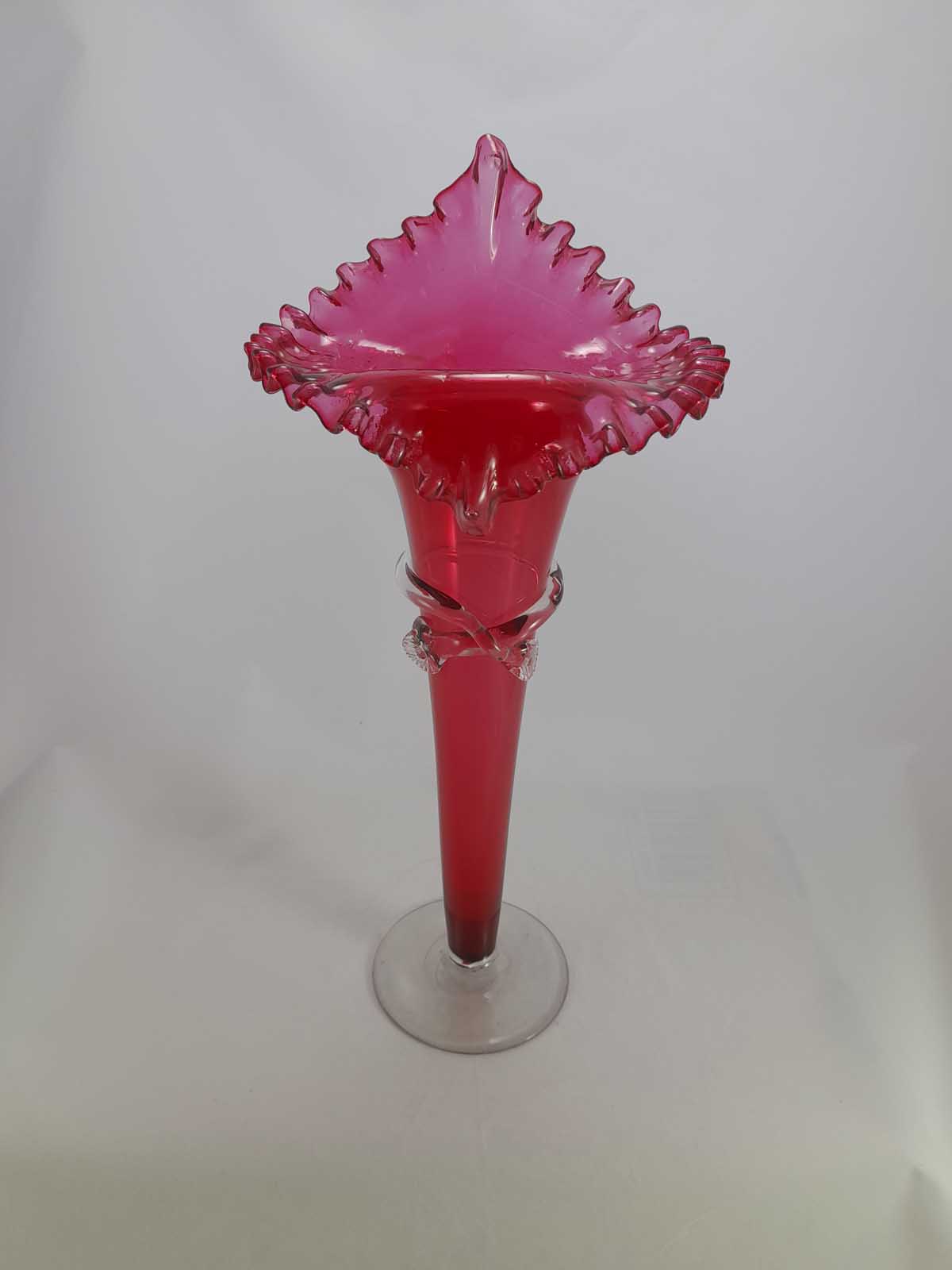 A stunning tall, crimped edge cranberry glass vase with a clear glass foot and wrapped around collar . Polished pontil to the base. Jack in the pulpit style.