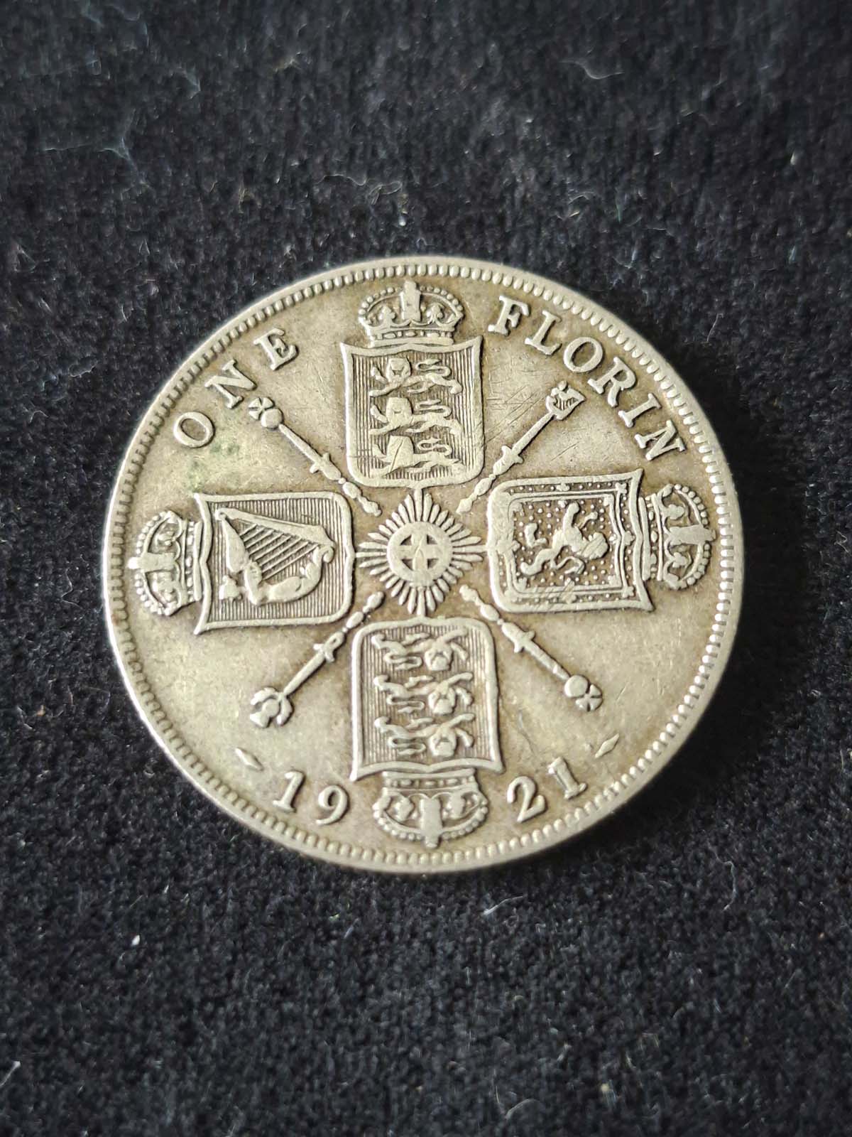 A UK one florin coin dated to 1921, composition Silver (.500) Grade F – VF Weight: 11.28g