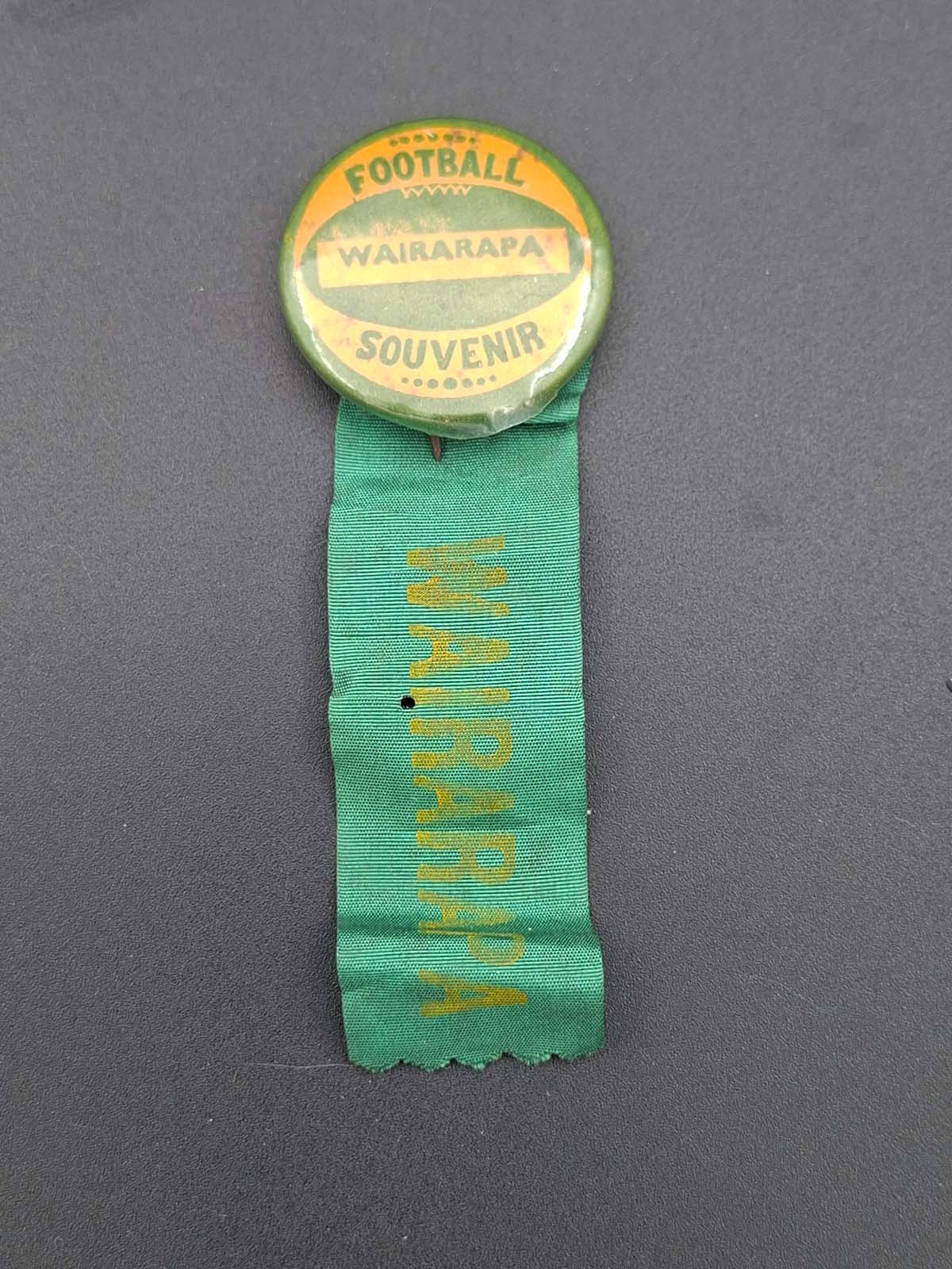 A vintage Wairarapa rugby souvenir badge/pin with attached ribbon. Origin : New Zealand