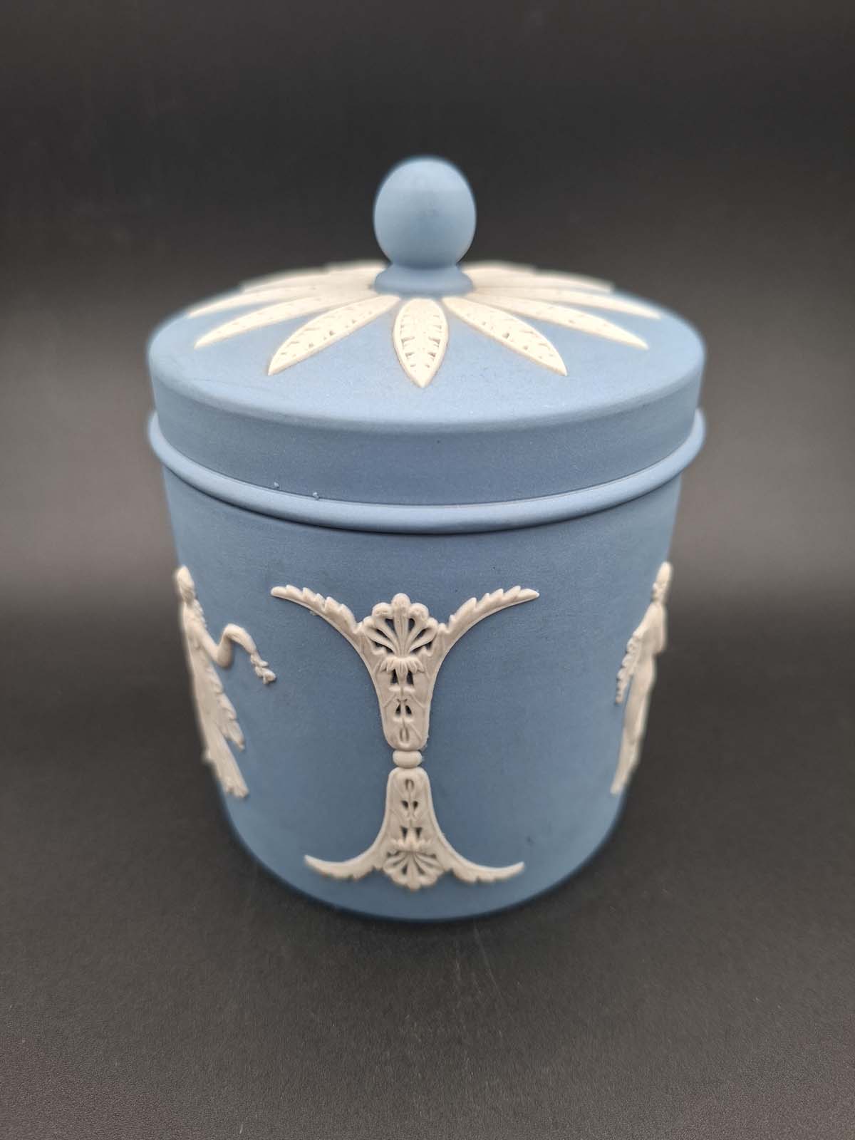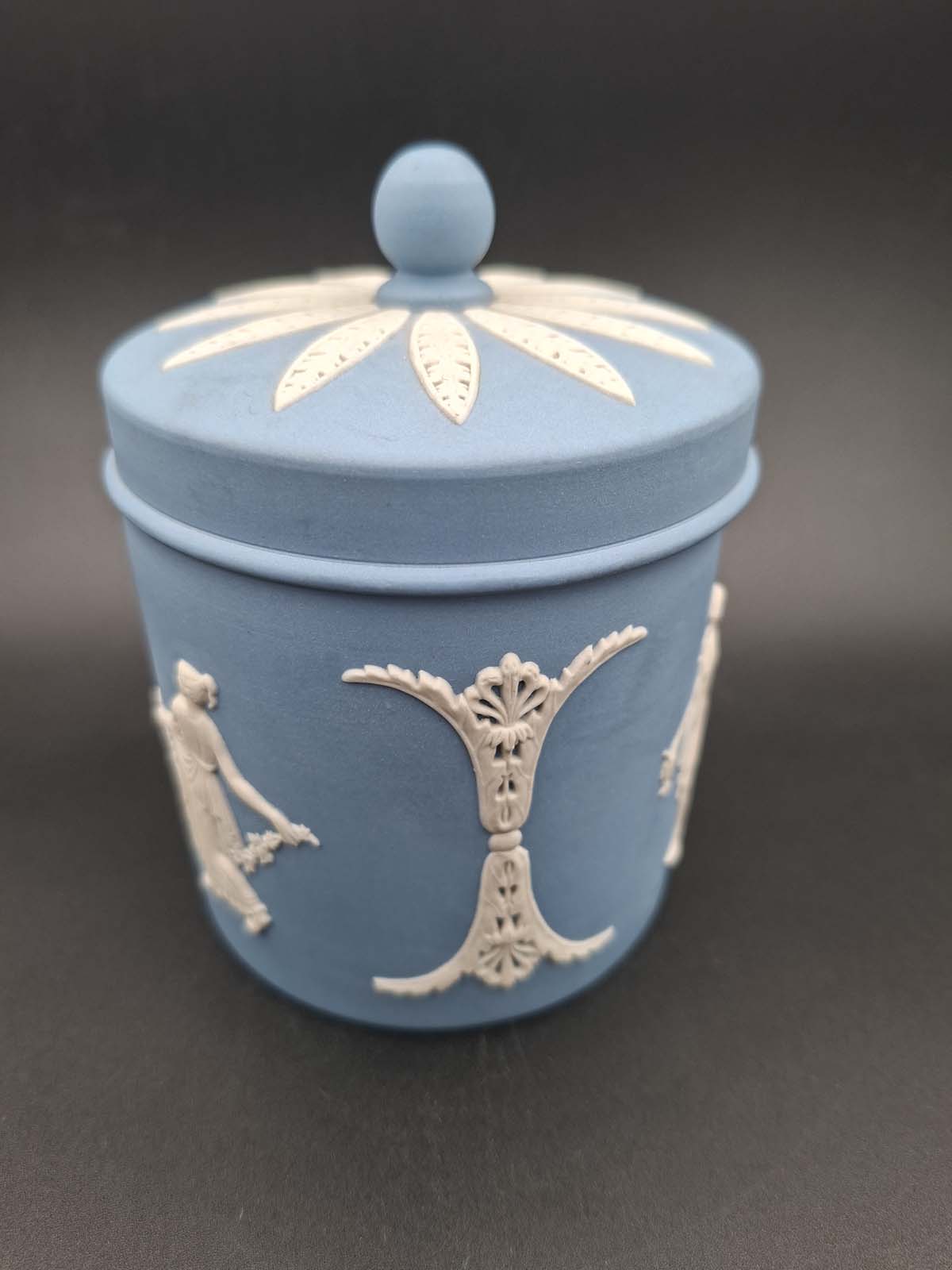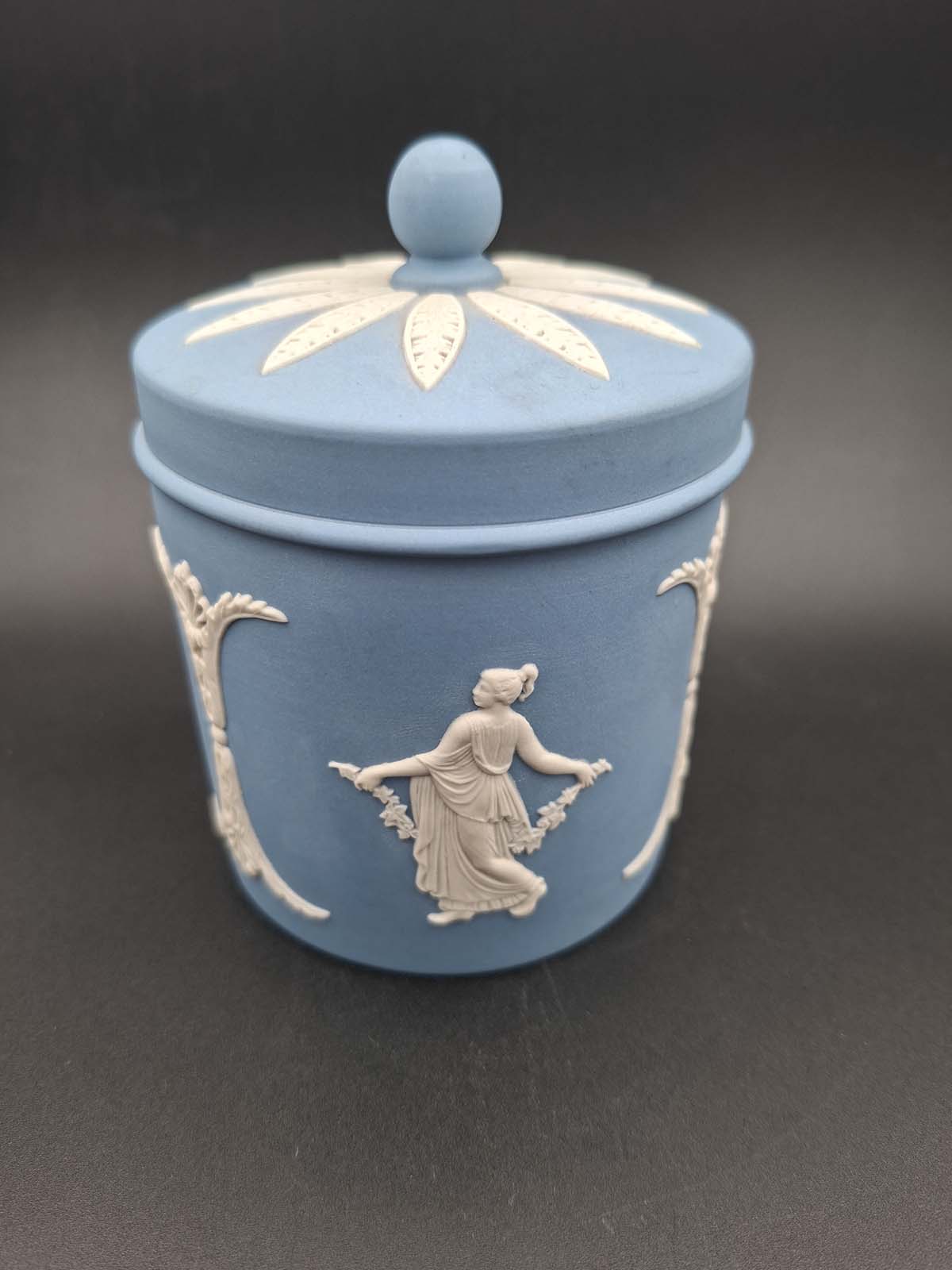 A nice pale blue Wedgwood jasperware lidded jar showing classical maidens in typical poses.