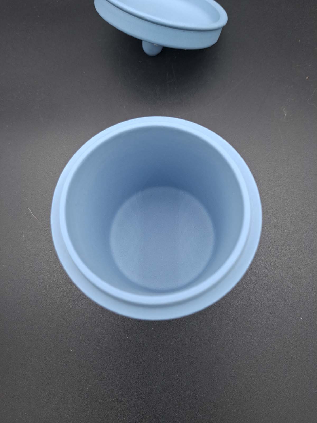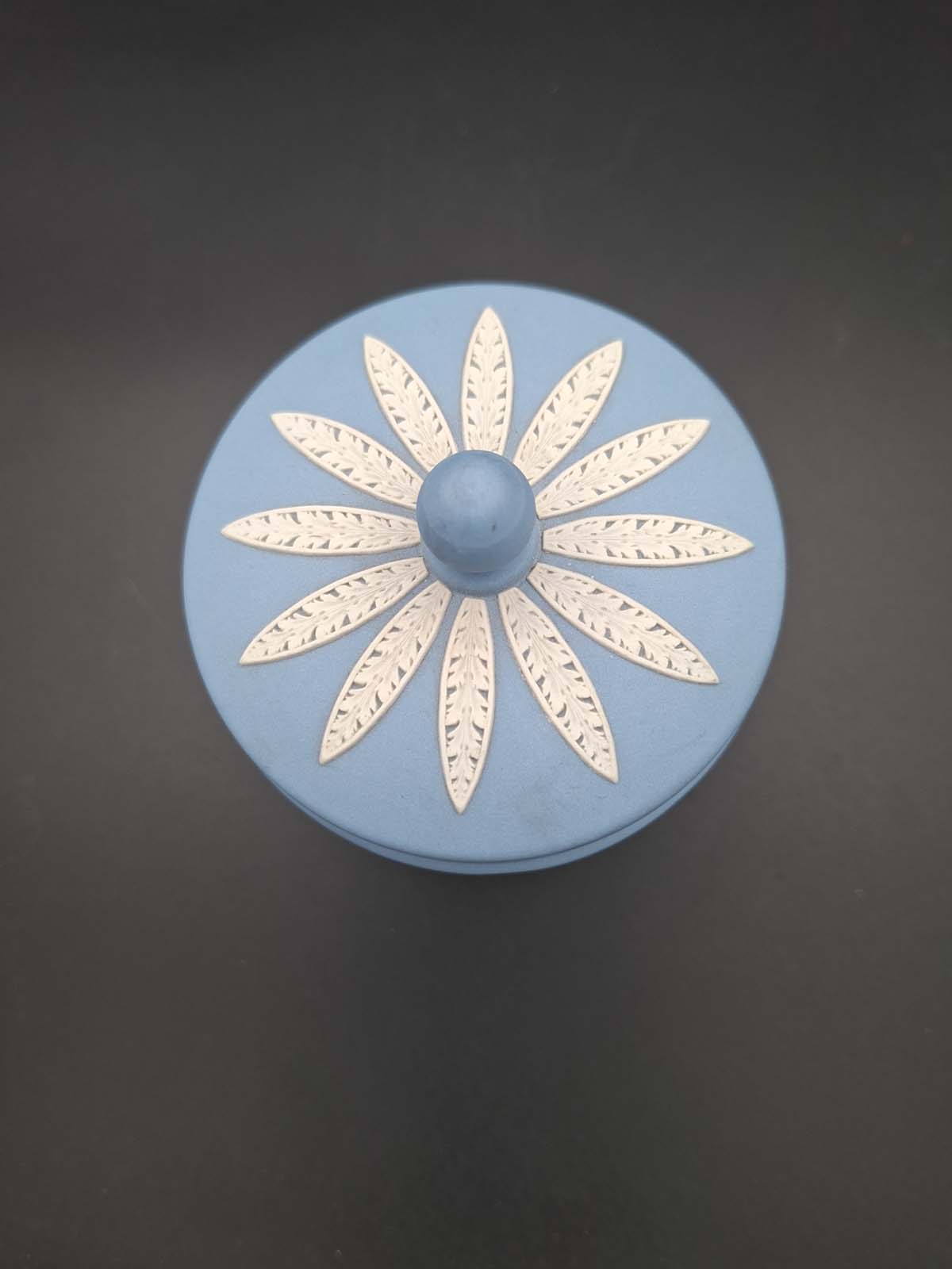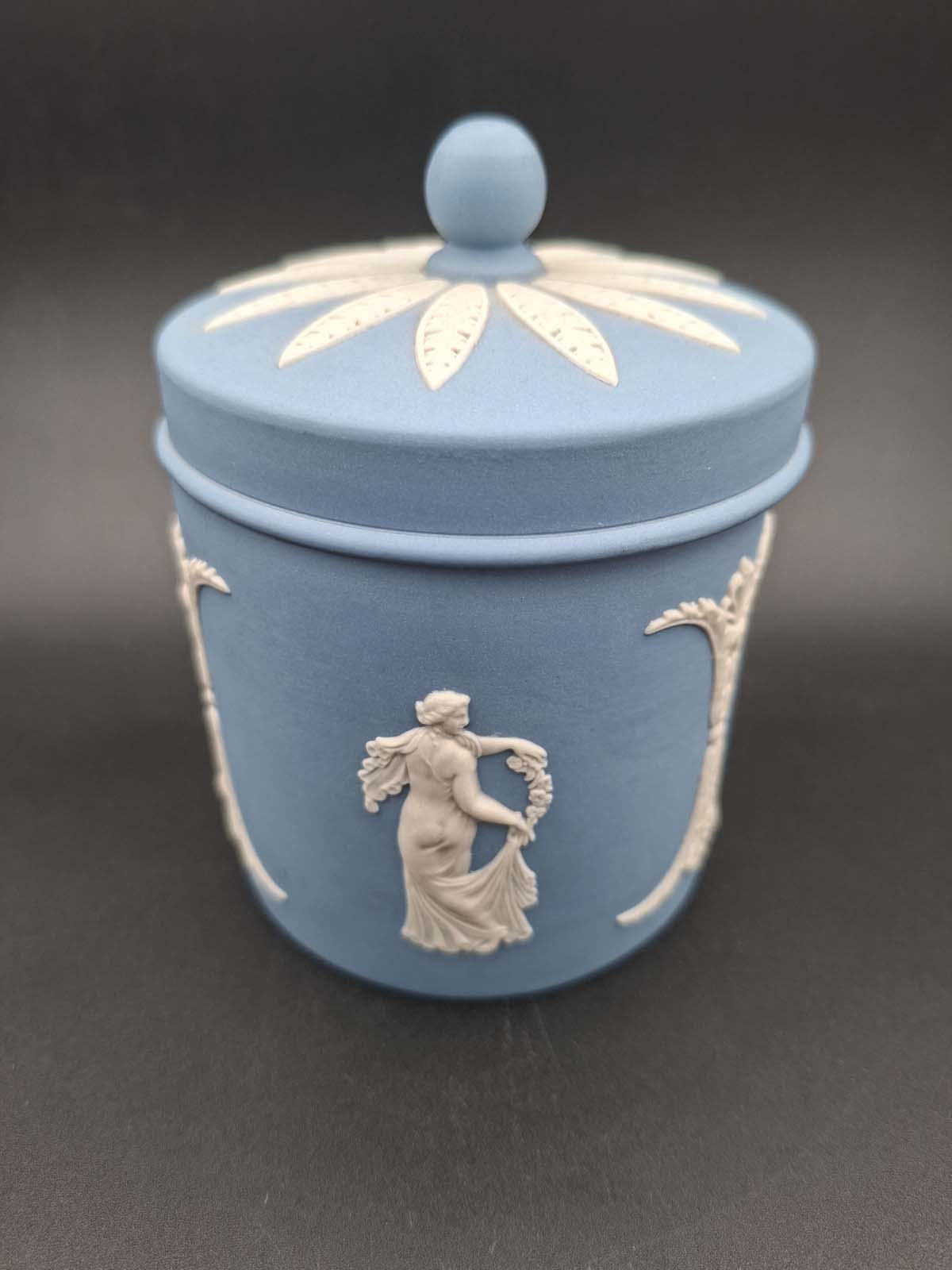 A nice pale blue Wedgwood jasperware lidded jar showing classical maidens in typical poses.