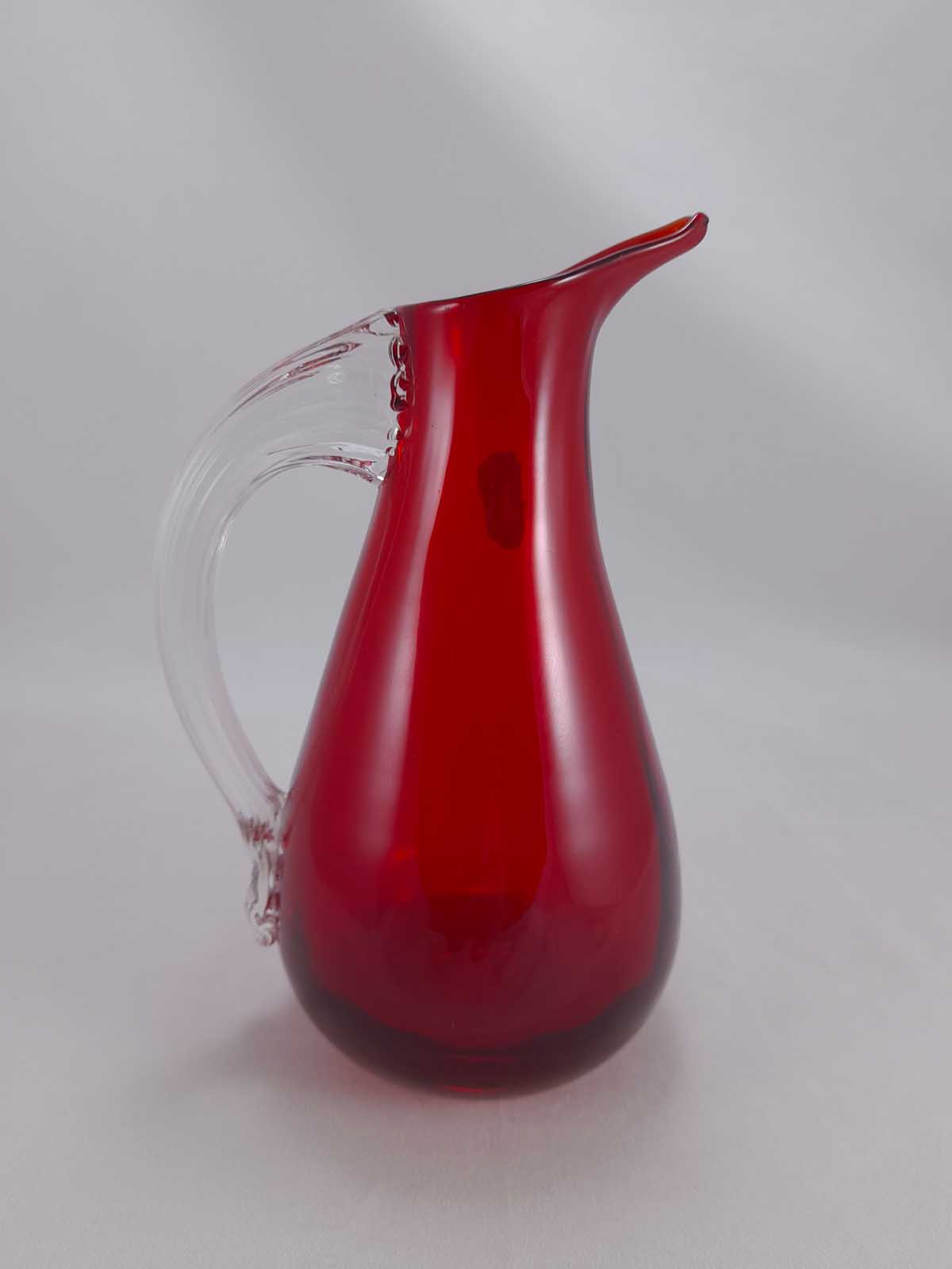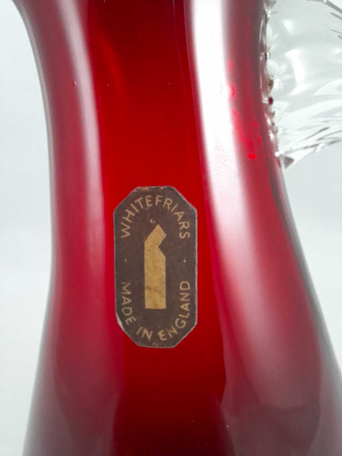A Stunningly beautiful Whitefriars sparrow beak ruby glass jug with clear ribbed glass applied handle complete with original Whitefriars label. These jugs come in various sizes.